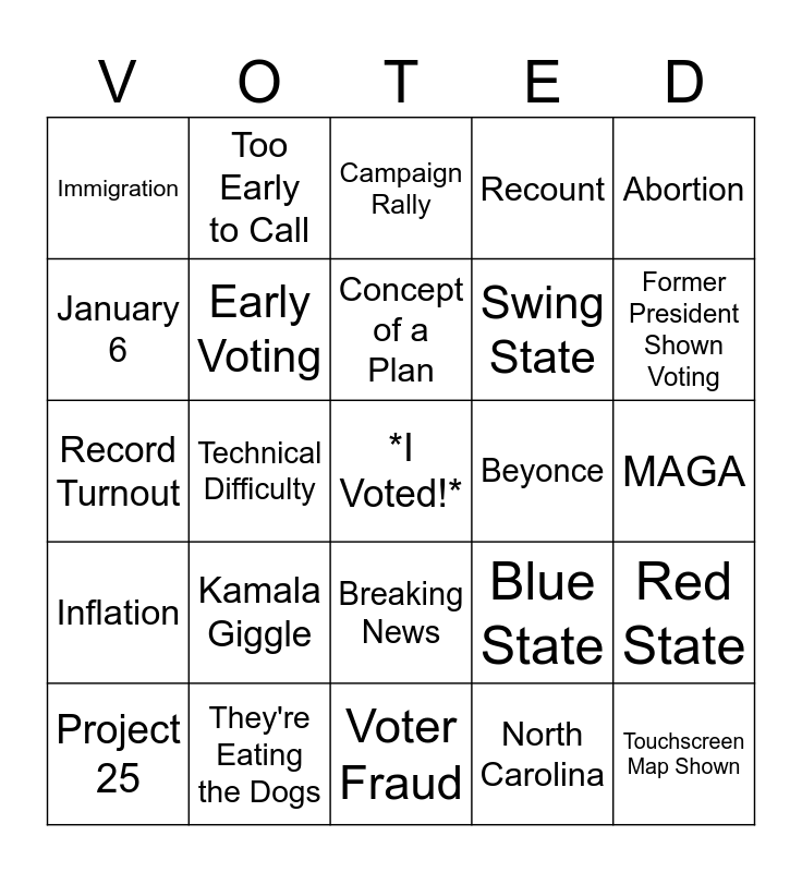 This bingo card has a free space and 24 words: Kamala Giggle, They're Eating the Dogs, Concept of a Plan, Project 25, Abortion, Immigration, January 6, Too Early to Call, Beyonce, Breaking News, Swing State, Record Turnout, Blue State, Red State, Early Voting, North Carolina, MAGA, Campaign Rally, Former President Shown Voting, Technical Difficulty, Touchscreen Map Shown, Inflation, Recount and Voter Fraud.