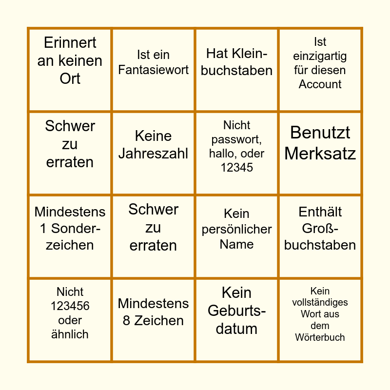 This bingo card has 16 words: Mindestens 8 Zeichen, Enthält Groß-buchstaben, Hat Klein-buchstaben, Erinnert an keinen Ort, Mindestens 1 Sonder-zeichen, Ist ein Fantasiewort, Kein persönlicher Name, Kein Geburts-datum, Schwer zu erraten, Keine Jahreszahl, Nicht 123456 oder ähnlich, Ist einzigartig für diesen Account, Schwer zu erraten, Benutzt Merksatz, Nicht passwort, hallo, oder 12345 and Kein vollständiges Wort aus dem Wörterbuch.