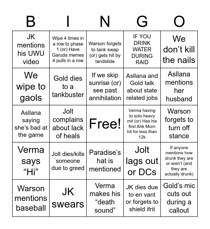 This bingo card has a free space and 29 words: Warson mentions baseball, Asllana complaining about casting GCD heals or wastes a ogcd shield, Jolt complains about lack of heals, Paradise dies due to Black Mage teleport(or lack of) (or) Doesn't agro spiny, JK mentions his UWU video, Warson forgets to tank swap (or) gets hit by landslide, Gold dies to a tankbuster, Jolt dies/kills someone due to greed, Verma having to solo heavy mit (or) Has his first Ahk Morn hit for less than 12k, JK swears, Warson forgets to turn off stance, Gold’s mic cuts out during a callout, Verma makes his “death sound”, JK dies due to en vant or forgets to shield ifrit, Asllana mentions her husband, Gold mentions how his HP is low/not getting healed, Paradise’s hat is mentioned, Verma says “Hi”, We don’t kill the nails, Asllana saying she’s bad at the game, Jolt lags out or DCs, Paradise gets a +200k Xenoglossy (or) Invulns Ifrit late, Asllana and Gold talk about state related jobs, We wipe to gaols, IF YOU DRINK WATER DURING RAID, Wipe 4 times in a row to phase 1 (or) Have Garuda memes 4 pulls in a row, If anyone mentions how drunk they are or aren’t (and they are actually drunk), If we skip sunrise (or) see past annihilation and someone says BRB when we are on break.