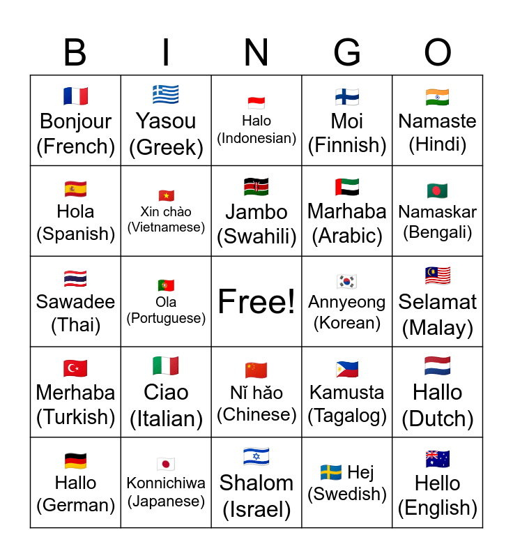 This bingo card has a free space and 24 words: 🇮🇹 Ciao (Italian), 🇯🇵Konnichiwa (Japanese), 🇰🇪Jambo (Swahili), 🇩🇪 Hallo (German), 🇮🇳Namaste (Hindi), 🇫🇷Bonjour (French), 🇪🇸 Hola (Spanish), 🇬🇷Yasou (Greek), 🇰🇷Annyeong (Korean), 🇨🇳 Nǐ hǎo (Chinese), 🇦🇪Marhaba (Arabic), 🇹🇭Sawadee (Thai), 🇵🇭Kamusta (Tagalog), 🇳🇱Hallo (Dutch), 🇻🇳 Xin chào (Vietnamese), 🇸🇪 Hej (Swedish), 🇲🇾 Selamat (Malay), 🇮🇩 Halo (Indonesian), 🇧🇩 Namaskar (Bengali), 🇵🇹 Ola (Portuguese), 🇦🇺 Hello (English), 🇹🇷 Merhaba (Turkish), 🇫🇮 Moi (Finnish) and 🇮🇱 Shalom (Israel).