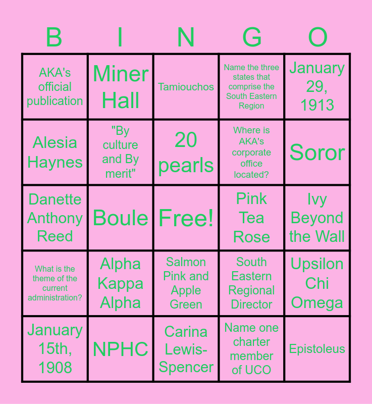 This bingo card has a free space and 24 words: Alpha Kappa Alpha, NPHC, 20 pearls, January 15th, 1908, January 29, 1913, AKA's official publication, Alesia Haynes, Miner Hall, Pink Tea Rose, Salmon Pink and Apple Green, Where is AKA's corporate office located?, Danette Anthony Reed, South Eastern Regional Director, Upsilon Chi Omega, "By culture and By merit", Name one charter member of UCO, Ivy Beyond the Wall, Tamiouchos, Soror, Boule, Epistoleus, What is the theme of the current administration?, Name the three states that comprise the South Eastern Region and Carina Lewis-Spencer.