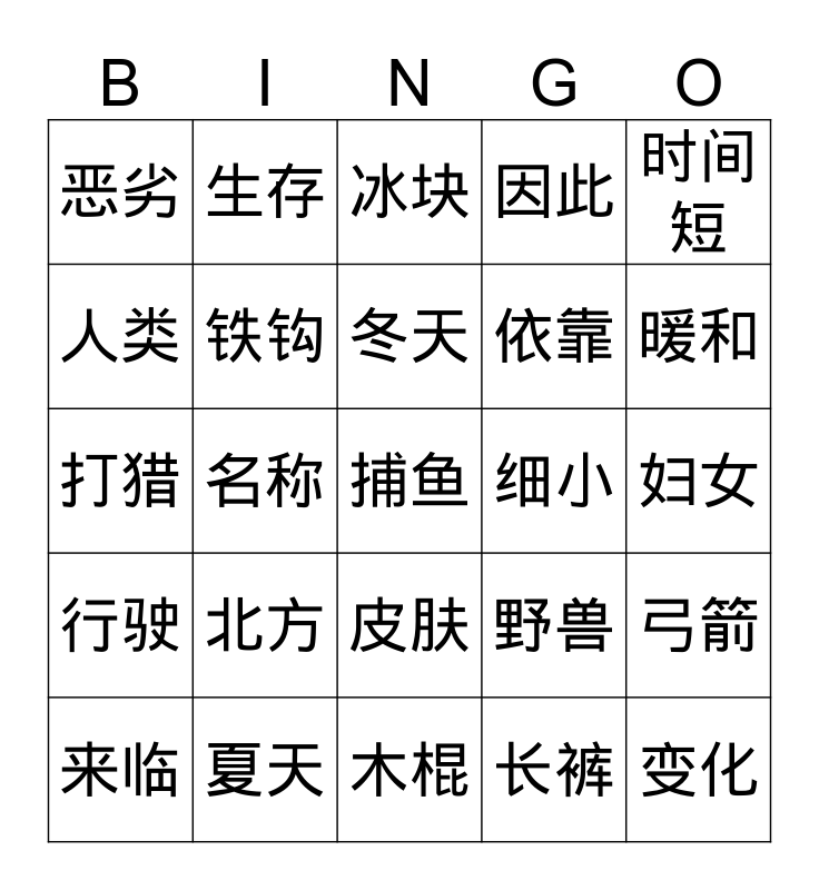 This bingo card has a free space and 24 words: 北方, 夏天, 冬天, 来临, 时间短, 恶劣, 人类, 生存, 细小, 皮肤, 依靠, 打猎, 野兽, 弓箭, 铁钩, 长裤, 妇女, 冰块, 暖和, 名称, 变化, 行驶, 因此 and 木棍.