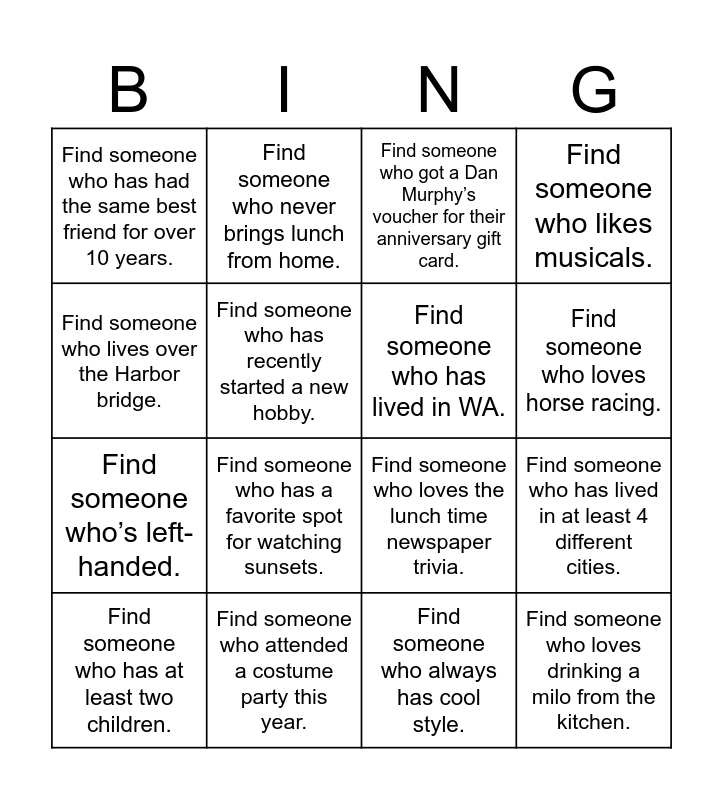 This bingo card has 92 words: Free!, Find someone who has been with the company for over five years., Find someone who speaks more than two languages., Find someone who has traveled to more than five countries., Find someone who has worked in a different industry before joining here., Find someone who has a pet that’s not a dog or a cat., Find someone who prefers tea over coffee., Find someone who has completed a marathon., Find someone who can play a musical instrument., Find someone who has a green thumb., Find someone who has never broken a bone., Find someone who has a unique talent or hobby., Find someone who loves karaoke., Find someone who’s left-handed., Find someone who has a birthday this month., Find someone who lives over the Harbor bridge., Find someone who got a Dan Murphy’s voucher for their anniversary gift card., Find someone who prefers remote work over in-office work., Find someone who’s read more than five books this year., Find someone who loves cooking or baking., Find someone who has recently watched a movie in the cinema., Find someone who loves camping., Find someone who has run into a celebrity before., Find someone who has lost their key card., Find someone who joined the SNG team in the past 2 months., Find someone who has lived in WA., Find someone who has worked in a pub., Find someone who knows the building manager’s name., Find someone who would bribe Robin to not be put on the media schedule., Find someone who loves Peroni’s., Find someone who can play a banging set on the decks., Find someone who has a tattoo., Find someone who had a Euro summer this year., Find someone who loves going for a coffee catch up., Find someone who never brings lunch from home., Find someone who is in the office 5 days a week., Find someone who works part-time., Find someone who’s camera doesn’t work on teams., Find someone who loves horse racing., Find someone who gets packages delivered to the office a lot., Find someone who loves the lunch time newspaper trivia., Find someone who loves drinking a milo from the kitchen., Find someone who always has cool style., Find someone who has at least two siblings., Find someone who has at least two children., Find someone who has flat mates., Find someone who wasn’t born in Australia., Find someone who has lived in Melbourne., Find someone who watches AFL., Find someone who has a car older than the year 1995., Find someone who has been skydiving., Find someone who uses their SNG water bottle., Find someone who is going overseas this summer., Find someone who has shaved their head before., Find someone who has dual citizenship., Find someone who has a unique nickname., Find some who is afraid of heights., Find someone who has recently started a new hobby., Find someone who loves spicy food., Find someone who has lived in at least 4 different cities., Find someone who remembers the first concert they went to., Find someone who can touch their toes without bending their knees., Find someone who is a cat person., Find someone who is an only child., Find someone who has won pub trivia before., Find someone who can drive manual., Find someone who has met a professional athlete., Find someone who knows a bit of sign language., Find someone who has been scuba diving., Find someone who has a personal mantra or motto., Find someone who journals., Find someone who can remember the first movie they saw in the theatres., Find someone who likes musicals., Find someone who is good at poker., Find someone who has a unique collection (e.g. vinyl records, sports cards)., Find someone who loves surfing., Find someone who has gone on a solo travel trip overseas., Find someone who is participating in Movember., Find someone who has donated blood., Find someone who likes anime., Find someone who has travelled on a train for over ten hours., Find someone who attended a costume party this year., Find someone who has had the same best friend for over 10 years., Find someone who posts of Strava., Find someone who has a bucket list item they have already ticked off., Find someone who has adopted a pet., Find someone who is currently learning a new language., Find someone who can say “hello” in five languages., Find someone who has tried pottery., Find someone who has been to a farmers’ market in the past month., Find someone who has a favorite spot for watching sunsets. and Find someone who has been to a wedding in the past year..
