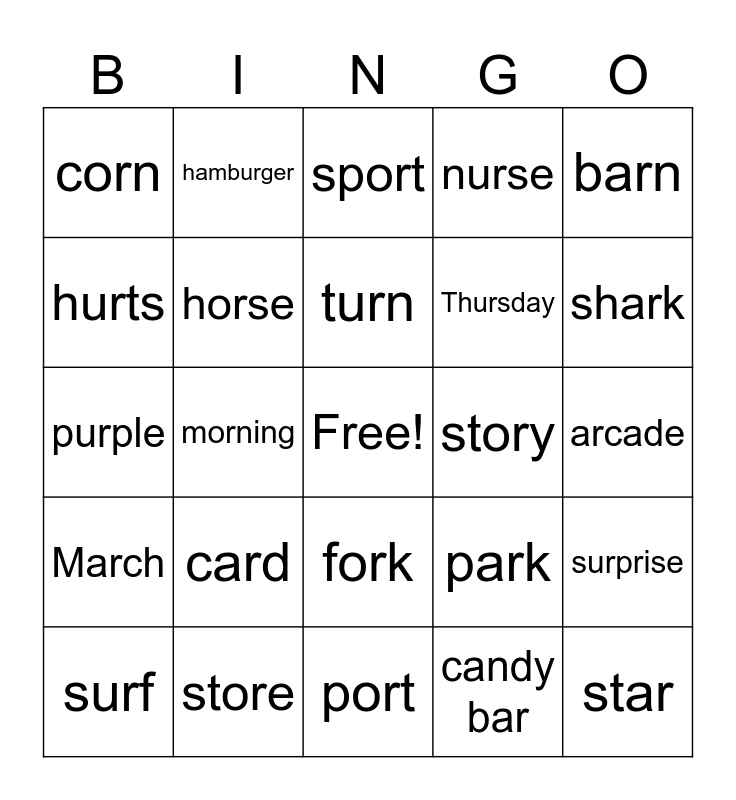This bingo card has a free space and 30 words: store, passport, morning, forty, corn, sport, horse, fork, story, port, arcade, star, candy bar, car, shark, start, park, March, card, barn, purple, turtle, hamburger, Thursday, hurts, nurse, surprise, surf, turn and burn.