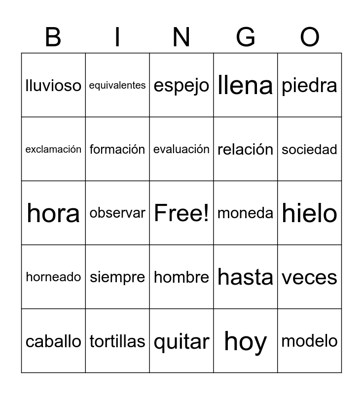This bingo card has a free space and 44 words: hora, modelo, regla, caballo, estrella, hoy, espejo, conductor, piedra, tortillas, llena, moneda, hombre, siempre, tierra, quitar, quitar, hora, superficie, sociedad, equivalentes, hueso, prueba, lluvioso, directamente, hielo, honesto, exterior, hasta, horneado, variedad, veces, instituto, significado, observar, personificación, congelación, situación, evaluación, exclamación, relación, desventaja, formación and superficie.