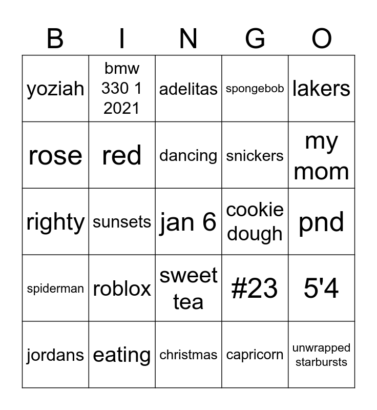 This bingo card has 30 words: jordans, mcdonalds, dancing, basketball, lakers, yoziah, bmw 330 1 2021, sweet tea, cookie dough, unwrapped starbursts, spiderman, red, math, capricorn, 5'4, inside out 2, sunsets, jan 6, #23, my mom, righty, eating, adelitas, snickers, pnd, rose, roblox, christmas, spongebob and fall.