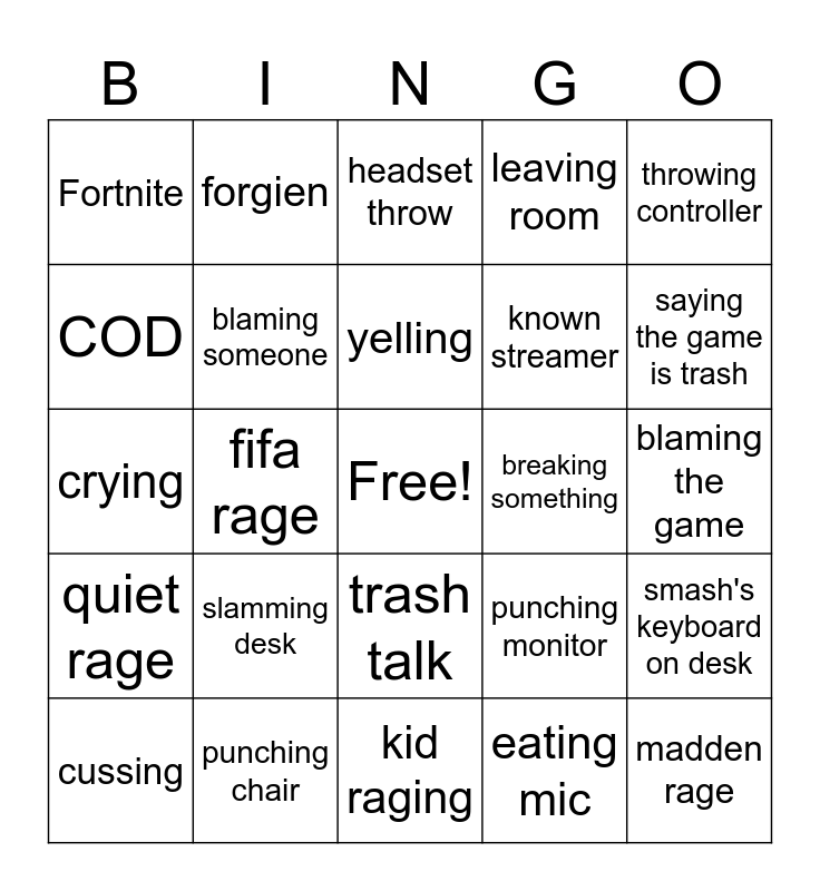 This bingo card has a free space and 24 words: slamming desk, punching chair, yelling, cussing, throwing controller, Fortnite, COD, forgien, breaking something, trash talk, known streamer, crying, punching monitor, smash's keyboard on desk, blaming someone, eating mic, blaming the game, headset throw, saying the game is trash, fifa rage, madden rage, quiet rage, leaving room and kid raging.
