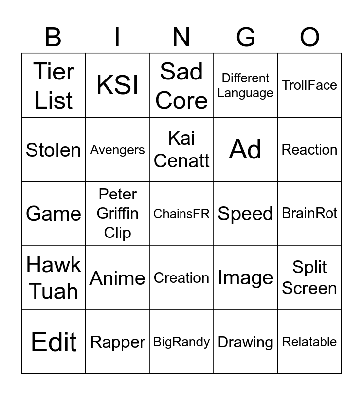 This bingo card has a free space and 24 words: Anime, Rapper, Kai Cenatt, Edit, TrollFace, Tier List, Stolen, KSI, Speed, Creation, Ad, Game, Image, Split Screen, Avengers, Drawing, BrainRot, Sad Core, Reaction, Peter Griffin Clip, Relatable, Hawk Tuah, Different Language and BigRandy.