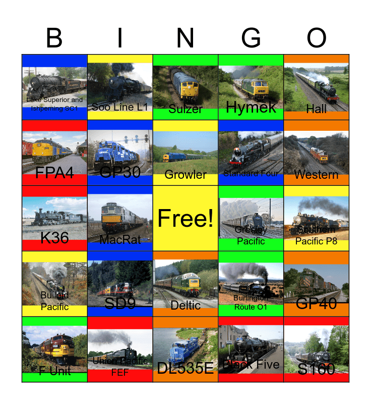 This bingo card has 24 images, a free space and 24 words: SD9, Union Pacific FEF, Growler, F Unit, Hall, Lake Superior and Ishpeming SC1, FPA4, Soo Line L1, Gresley Pacific, Deltic, Standard Four, K36, Burlington Route O1, GP40, GP30, Black Five, Southern Pacific P8, Sulzer, Western, MacRat, S160, Bulleid Pacific, Hymek and DL535E.