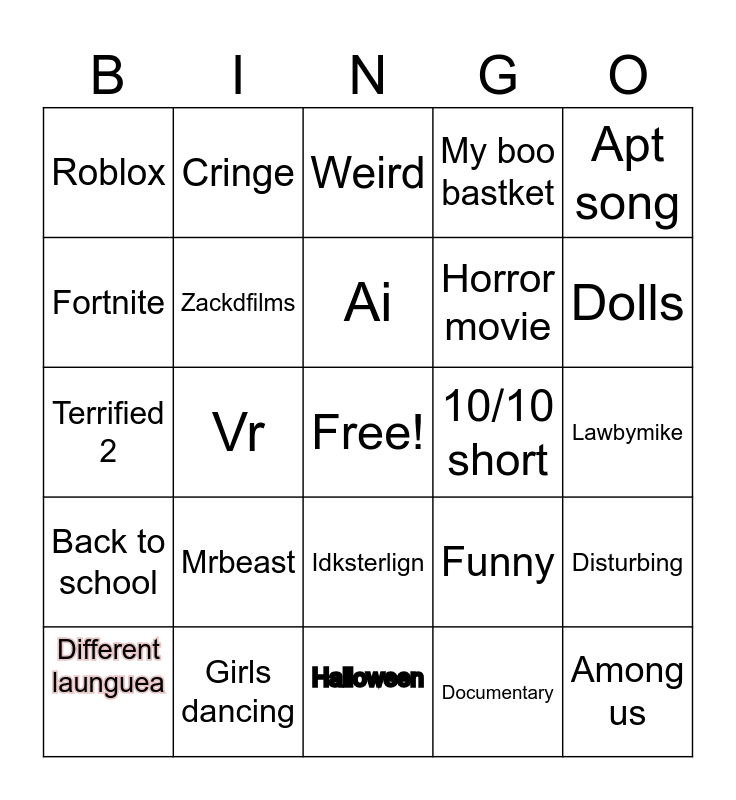 This bingo card has a free space and 24 words: Mrbeast, Girls dancing, Ai, Different launguea, Apt song, Roblox, Fortnite, Cringe, 10/10 short, Idksterlign, Horror movie, Terrified 2, Funny, Disturbing, Zackdfilms, Documentary, Lawbymike, Weird, Dolls, Vr, Among us, Back to school, My boo bastket and Halloween.