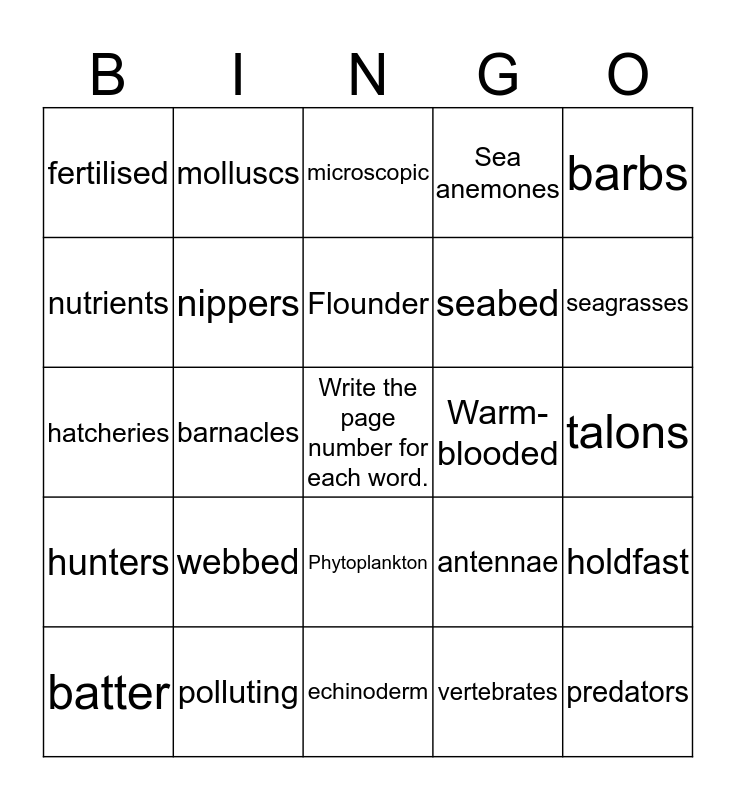 This bingo card has a free space and 24 words: webbed, polluting, Flounder, batter, barbs, fertilised, nutrients, molluscs, Warm-blooded, Phytoplankton, seabed, hatcheries, antennae, holdfast, nippers, vertebrates, talons, microscopic, seagrasses, barnacles, predators, hunters, Sea anemones and echinoderm.