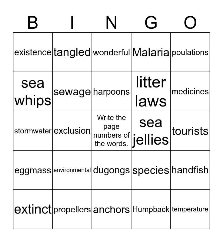 This bingo card has a free space and 24 words: environmental, propellers, harpoons, extinct, poulations, existence, sea whips, tangled, sea jellies, dugongs, litter laws, stormwater, species, handfish, sewage, Humpback, tourists, wonderful, medicines, exclusion, temperature, eggmass, Malaria and anchors.