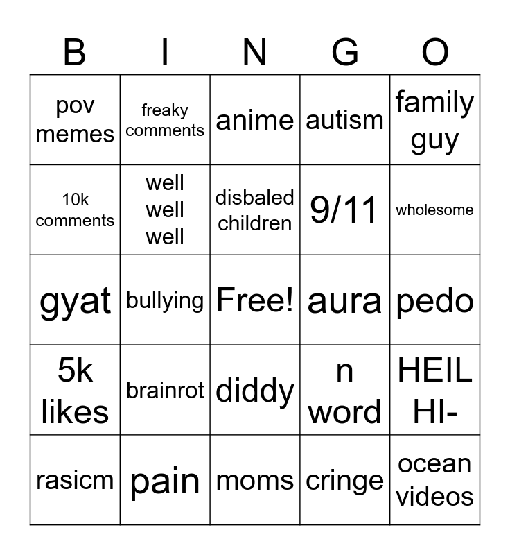 This bingo card has a free space and 24 words: brainrot, pain, disbaled children, rasicm, family guy, pov memes, 10k comments, freaky comments, aura, diddy, 9/11, gyat, n word, HEIL HI-, well well well, cringe, pedo, anime, wholesome, bullying, ocean videos, 5k likes, autism and moms.