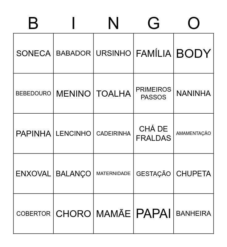 This bingo card has 25 words: BALANÇO, MAMÃE, TOALHA, COBERTOR, BODY, SONECA, BEBEDOURO, BABADOR, CHÁ DE FRALDAS, MATERNIDADE, PRIMEIROS PASSOS, PAPINHA, GESTAÇÃO, CHUPETA, MENINO, BANHEIRA, AMAMENTAÇÃO, URSINHO, NANINHA, LENCINHO, CADEIRINHA, CHORO, ENXOVAL, FAMÍLIA and PAPAI.