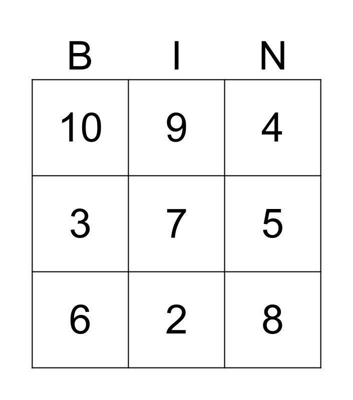 This bingo card has a free space and 8 words: 5, 4, 9, 6, 10, 8, 3 and 2.