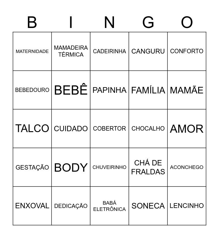 This bingo card has 25 words: BODY, BABÁ ELETRÔNICA, PAPINHA, ENXOVAL, CONFORTO, MATERNIDADE, BEBEDOURO, MAMADEIRA TÉRMICA, CHOCALHO, CHUVEIRINHO, FAMÍLIA, TALCO, CHÁ DE FRALDAS, ACONCHEGO, BEBÊ, LENCINHO, AMOR, CADEIRINHA, MAMÃE, CUIDADO, COBERTOR, DEDICAÇÃO, GESTAÇÃO, CANGURU and SONECA.