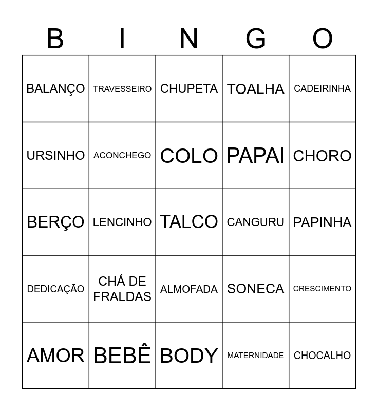 This bingo card has a free space and 24 words: CHÁ DE FRALDAS, BEBÊ, COLO, AMOR, CADEIRINHA, BALANÇO, URSINHO, TRAVESSEIRO, CANGURU, ALMOFADA, PAPAI, BERÇO, SONECA, CRESCIMENTO, ACONCHEGO, MATERNIDADE, PAPINHA, CHUPETA, CHORO, LENCINHO, CHOCALHO, DEDICAÇÃO, TOALHA and BODY.