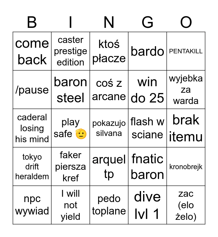 This bingo card has a free space and 24 words: faker piersza kref, I will not yield, coś z arcane, npc wywiad, PENTAKILL, come back, /pause, caster prestige edition, flash w sciane, arquel tp, win do 25, caderal losing his mind, fnatic baron, kronobrejk, baron steel, dive lvl 1, brak itemu, ktoś płacze, wyjebka za warda, play safe 🫡, zac (elo żelo), tokyo drift heraldem, bardo and pedo toplane.
