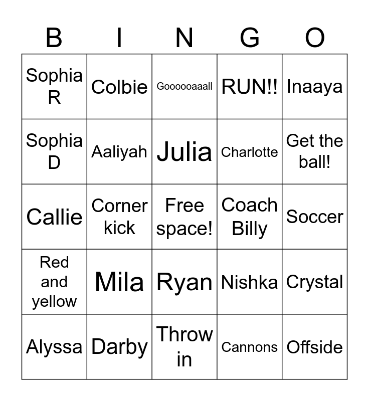 This bingo card has a free space and 24 words: Mila, Darby, Julia, Alyssa, Inaaya, Sophia R, Sophia D, Colbie, Coach Billy, Ryan, Charlotte, Callie, Nishka, Crystal, Aaliyah, Cannons, Soccer, Goooooaaall, Get the ball!, Corner kick, Offside, Red and yellow, RUN!! and Throw in.
