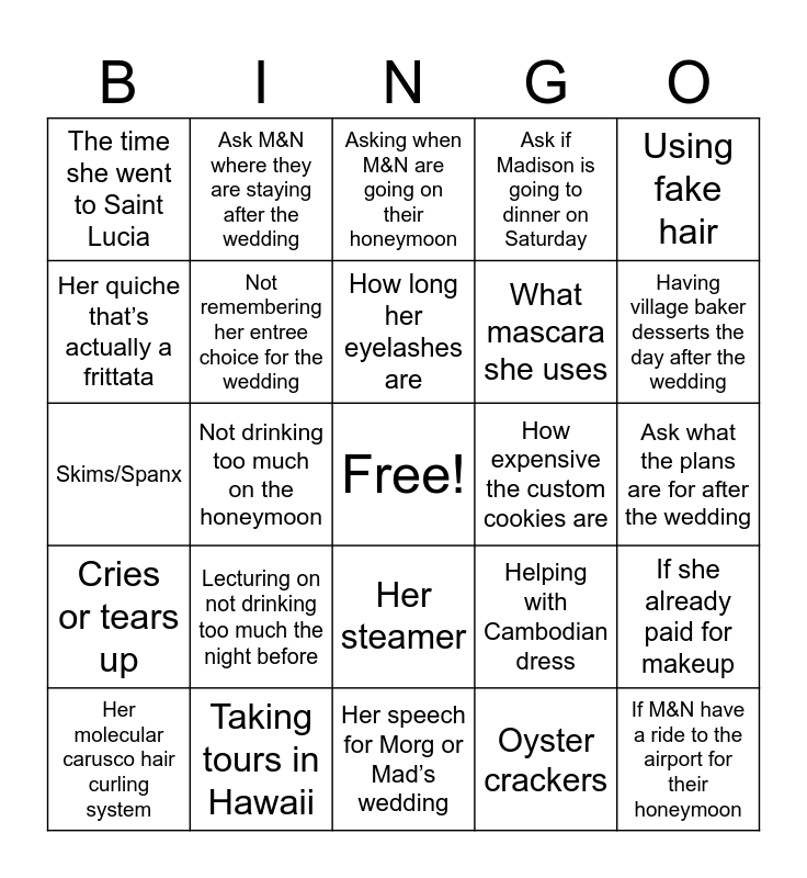 This bingo card has a free space and 24 words: Lecturing on not drinking too much the night before, Taking tours in Hawaii, How long her eyelashes are, Her molecular carusco hair curling system, Using fake hair, The time she went to Saint Lucia, Her quiche that’s actually a frittata, Ask M&N where they are staying after the wedding, How expensive the custom cookies are, Her steamer, What mascara she uses, Skims/Spanx, Helping with Cambodian dress, If she already paid for makeup, Not remembering her entree choice for the wedding, Oyster crackers, Ask what the plans are for after the wedding, Asking when M&N are going on their honeymoon, Having village baker desserts the day after the wedding, Not drinking too much on the honeymoon, If M&N have a ride to the airport for their honeymoon, Cries or tears up, Ask if Madison is going to dinner on Saturday and Her speech for Morg or Mad’s wedding.