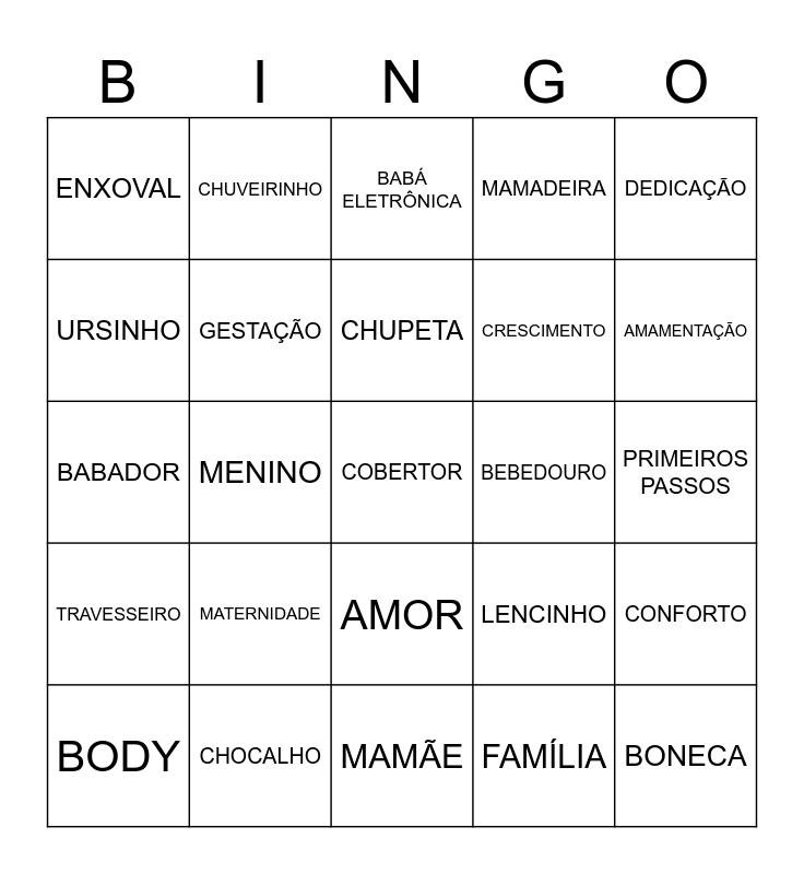 This bingo card has a free space and 24 words: MATERNIDADE, CHOCALHO, CHUPETA, BODY, DEDICAÇÃO, ENXOVAL, URSINHO, CHUVEIRINHO, BEBEDOURO, AMOR, CRESCIMENTO, BABADOR, LENCINHO, CONFORTO, GESTAÇÃO, FAMÍLIA, PRIMEIROS PASSOS, BABÁ ELETRÔNICA, AMAMENTAÇÃO, MENINO, BONECA, TRAVESSEIRO, MAMADEIRA and MAMÃE.