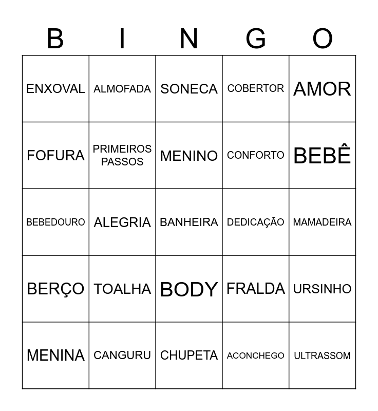 This bingo card has a free space and 24 words: TOALHA, CANGURU, MENINO, MENINA, AMOR, ENXOVAL, FOFURA, ALMOFADA, DEDICAÇÃO, BODY, CONFORTO, BEBEDOURO, FRALDA, URSINHO, PRIMEIROS PASSOS, ACONCHEGO, MAMADEIRA, SONECA, BEBÊ, ALEGRIA, ULTRASSOM, BERÇO, COBERTOR and CHUPETA.