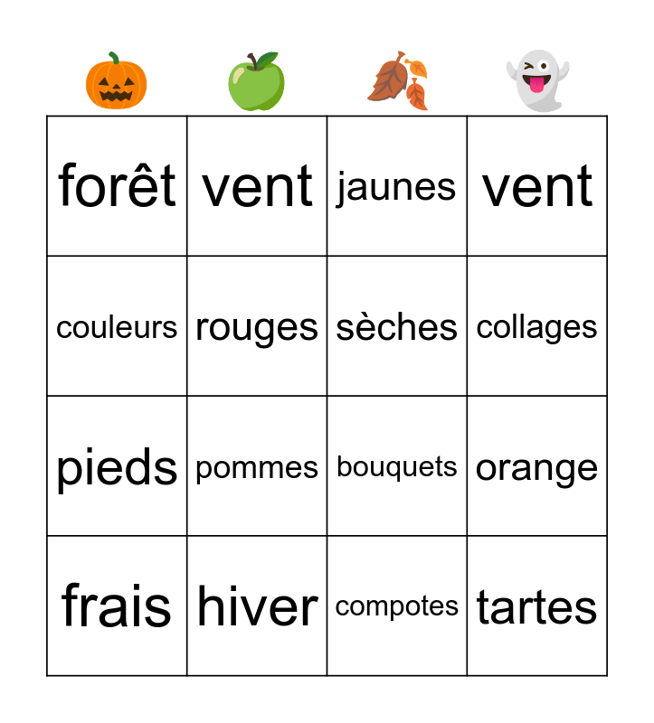 This bingo card has 16 words: hiver, orange, jaunes, forêt, pieds, vent, bouquets, compotes, couleurs, rouges, frais, vent, pommes, collages, sèches and tartes.