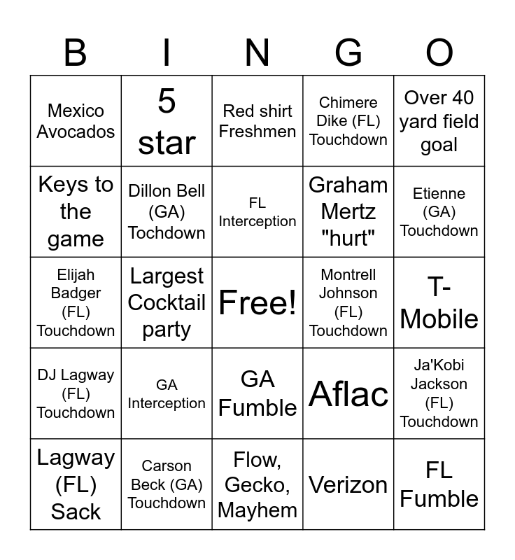 This bingo card has a free space and 27 words: Aflac, UGA (mascot), Graham Mertz "hurt", Flow, Gecko, Mayhem, Keys to the game, Red shirt Freshmen, 5 star, DJ Lagway (FL) Touchdown, Montrell Johnson (FL) Touchdown, Ja'Kobi Jackson (FL) Touchdown, Elijah Badger (FL) Touchdown, Chimere Dike (FL) Touchdown, Lagway (FL) Sack, Carson Beck (GA) Touchdown, Etienne (GA) Touchdown, Arian Smith (GA) Touchdown, Dillon Bell (GA) Tochdown, FL Interception, GA Interception, Mexico Avocados, T-Mobile, Verizon, Largest Cocktail party, FL Fumble, GA Fumble, Over 40 yard field goal and Go for it on 4th down.