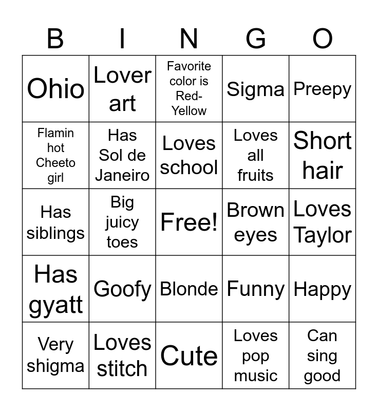 This bingo card has a free space and 24 words: Goofy, Loves stitch, Loves school, Very shigma, Preepy, Ohio, Flamin hot Cheeto girl, Lover art, Brown eyes, Blonde, Loves all fruits, Has siblings, Funny, Happy, Has Sol de Janeiro, Loves pop music, Loves Taylor, Favorite color is Red-Yellow, Short hair, Big juicy toes, Can sing good, Has gyatt, Sigma and Cute.