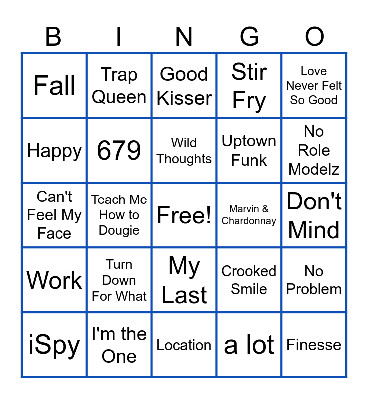 This bingo card has a free space and 75 words: Love On Top, Drunk in Love, Good Kisser, Motivation, Sure Thing, Party, 24K Magic, Cranes in the Sky, Adorn, Level Up, OMG, Old Town Road (Remix), Wild Thoughts, Happy, Watch Me, Teach Me How to Dougie, Controlla, Finesse, Nice For What, Love Never Felt So Good, My House, Can't Feel My Face, 679, Trap Queen, Stir Fry, Bad & Boujee, Oui, Redbone, Classic Man, Rolex, That’s What I Like, Loyal, Go Crazy, Crooked Smile, No Role Modelz, Uptown Funk, Moment 4 Life, Swag Surfin', Don't Mind, a lot, Black Beatles, In My Feelings, Humble, Cut It, JuJu on That Beat, Mask Off, iSpy, Fall, The Man, No Hands, Over, My Last, IDFWY, Bodak Yellow, Panda, Unforgettable, This is America, Lucid Dreams, Truth Hurts, Nothin' On You, Turn Down For What, All of Me, Sicko Mode, No Hands, Smile (Living My Best Life), Marvin & Chardonnay, Lotus Flower Bomb, Diamonds, Hotline Bling, No Problem, Work, I'm the One, Suge, Location and Talk.