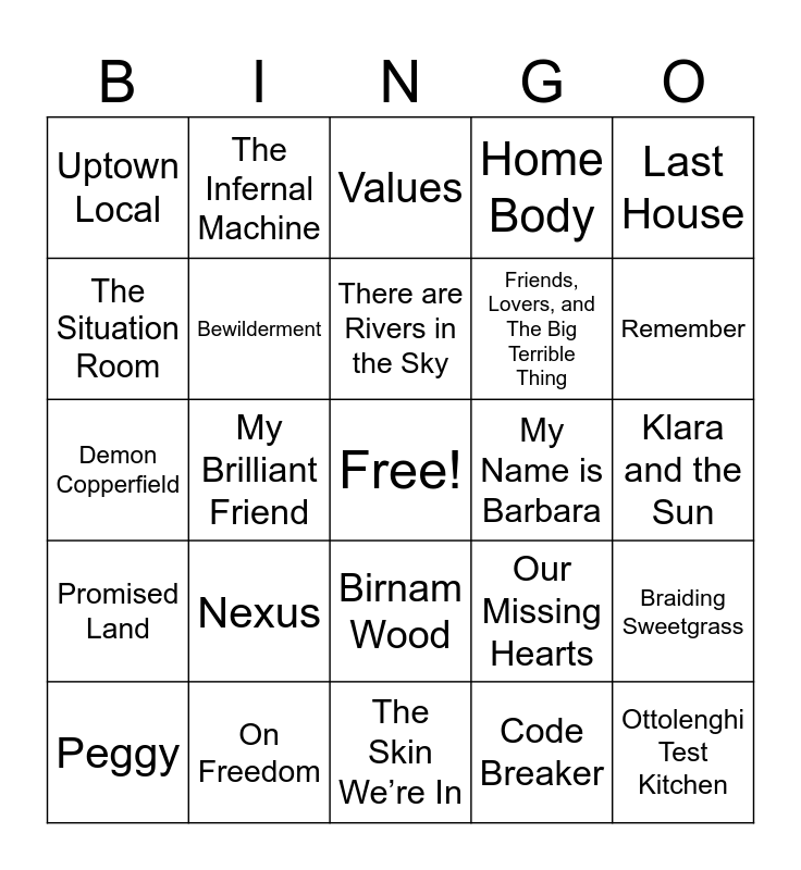 This bingo card has a free space and 24 words: Nexus, On Freedom, There are Rivers in the Sky, Peggy, Last House, Uptown Local, The Situation Room, The Infernal Machine, My Name is Barbara, Birnam Wood, Friends, Lovers, and The Big Terrible Thing, Demon Copperfield, Our Missing Hearts, Braiding Sweetgrass, Bewilderment, Code Breaker, Klara and the Sun, Values, Remember, My Brilliant Friend, Ottolenghi Test Kitchen, Promised Land, Home Body and The Skin We’re In.