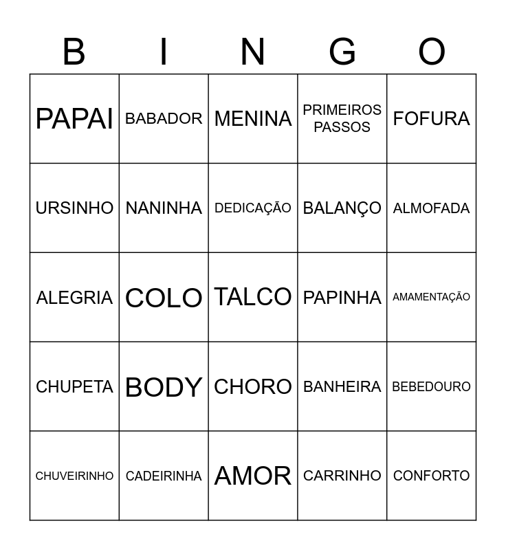 This bingo card has a free space and 24 words: BODY, CADEIRINHA, DEDICAÇÃO, CHUVEIRINHO, FOFURA, PAPAI, URSINHO, BABADOR, PAPINHA, CHORO, BALANÇO, ALEGRIA, BANHEIRA, BEBEDOURO, NANINHA, CARRINHO, AMAMENTAÇÃO, MENINA, ALMOFADA, COLO, CONFORTO, CHUPETA, PRIMEIROS PASSOS and AMOR.