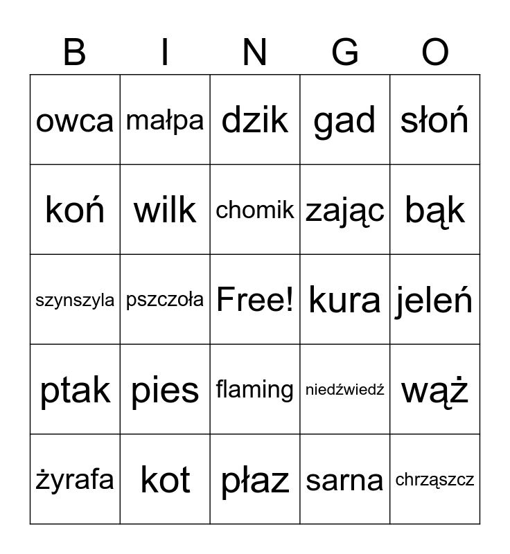 This bingo card has a free space and 24 words: pies, kot, chomik, żyrafa, słoń, owca, koń, małpa, kura, flaming, zając, szynszyla, niedźwiedź, wąż, wilk, sarna, jeleń, dzik, bąk, pszczoła, chrząszcz, ptak, gad and płaz.