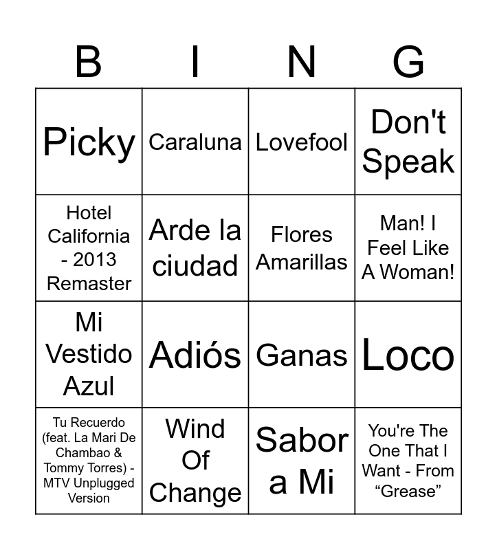 This bingo card has 78 words: Free!, Laura no está, Lovefool, Si El Amor Se Cae, Lollipop, Perfecta (Versión 2023), Mi Primer Millon, Flaca, Don't Dream It's Over, abc (nicer), Bonito, I Just Called To Say I Love You, Don't Speak, Picky, Pupilas Lejanas (feat. Kevin Johansen), Arde la ciudad, Somethin' Stupid, The Only Exception, Do I Wanna Know?, Sabor a Mi, How Deep Is Your Love, Hotel California - 2013 Remaster, Ganas, Man! I Feel Like A Woman!, Flores Amarillas, Procura, Se Me Olvidó Otra Vez - Unplugged, Funkytown, Last Train to London, Lento, Adiós, Cupid - Twin Ver., Funkytown - Single Version, Algo Está Cambiando, Da Ya Think I'm Sexy?, Wind Of Change, Pasos Al Costado, Vueltas, un x100to, Tu Recuerdo (feat. La Mari De Chambao & Tommy Torres) - MTV Unplugged Version, Seguir Viviendo Sin Tu Amor, Bicho de Ciudad, Pequeños Sueños, Todo Todo, Corazón, Caraluna, Dancing Queen, Puedes Contar Conmigo, Onda Onda (Olha a Onda), Mucho mejor (feat. Coque Malla), Mamma Mia, Loco, Creep, You Can Leave Your Hat On, VAGABUNDO, Nothing's Gonna Stop Us Now, CORAZÓN VACÍO, ADIÓS, Sunday Morning, Creep, Mi Vestido Azul, Bachata En Fukuoka, A rodar mi vida, Another Brick in the Wall, Pt. 2, No soy una de esas (feat. Alejandro Sanz), Tu Misterioso Alguien, Snow (Hey Oh), Chora, Me Liga, You're The One That I Want - From “Grease”, La Flor Más Bella, Me Gusta, What's Up?, 11 Y 6, Entrégate, Hacer un Puente, Cae el Sol, Oh, Pretty Woman and Algo.