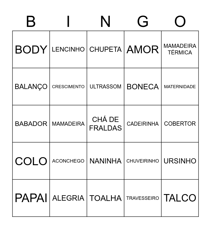 This bingo card has a free space and 24 words: ACONCHEGO, ALEGRIA, ULTRASSOM, PAPAI, MAMADEIRA TÉRMICA, BODY, BALANÇO, LENCINHO, CADEIRINHA, NANINHA, BONECA, BABADOR, CHUVEIRINHO, URSINHO, CRESCIMENTO, TRAVESSEIRO, COBERTOR, CHUPETA, MATERNIDADE, MAMADEIRA, TALCO, COLO, AMOR and TOALHA.