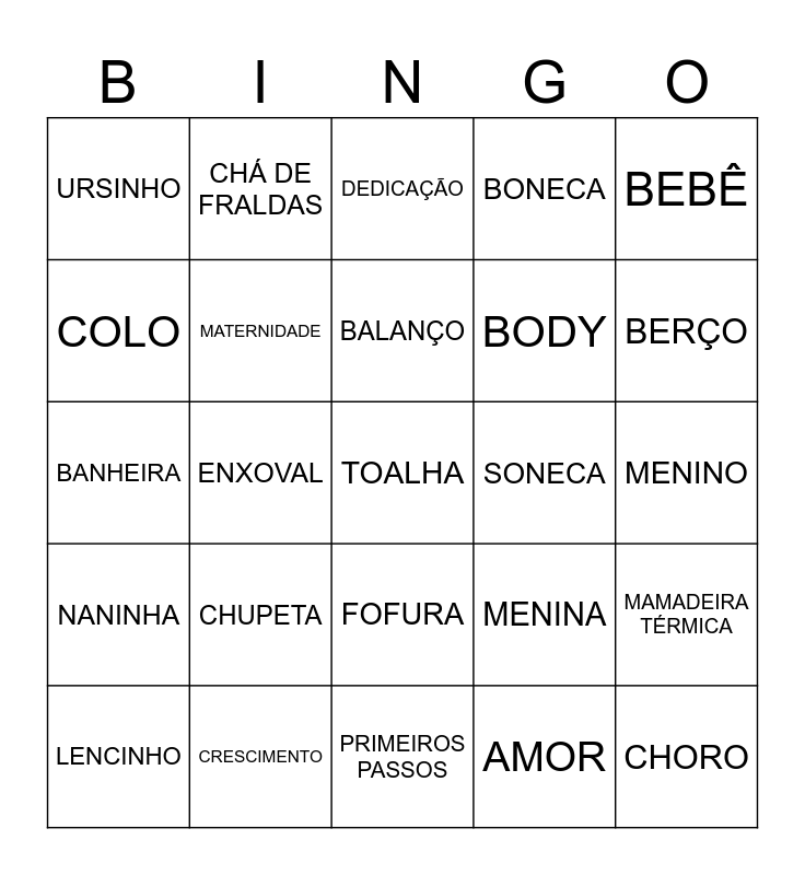 This bingo card has a free space and 24 words: CHUPETA, CRESCIMENTO, BALANÇO, LENCINHO, BEBÊ, URSINHO, COLO, CHÁ DE FRALDAS, SONECA, FOFURA, BODY, BANHEIRA, MENINA, MAMADEIRA TÉRMICA, MATERNIDADE, AMOR, MENINO, DEDICAÇÃO, BERÇO, ENXOVAL, CHORO, NANINHA, BONECA and PRIMEIROS PASSOS.