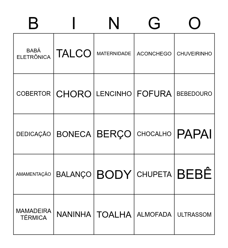 This bingo card has a free space and 24 words: BALANÇO, NANINHA, LENCINHO, MAMADEIRA TÉRMICA, CHUVEIRINHO, BABÁ ELETRÔNICA, COBERTOR, TALCO, CHOCALHO, BODY, FOFURA, DEDICAÇÃO, CHUPETA, BEBÊ, CHORO, ALMOFADA, PAPAI, MATERNIDADE, BEBEDOURO, BONECA, ULTRASSOM, AMAMENTAÇÃO, ACONCHEGO and TOALHA.