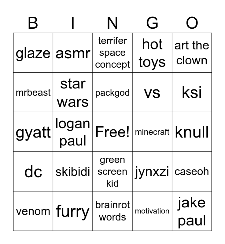 This bingo card has a free space and 24 words: skibidi, furry, packgod, venom, art the clown, glaze, mrbeast, asmr, minecraft, green screen kid, vs, gyatt, jynxzi, caseoh, star wars, motivation, knull, terrifer space concept, ksi, logan paul, jake paul, dc, hot toys and brainrot words.