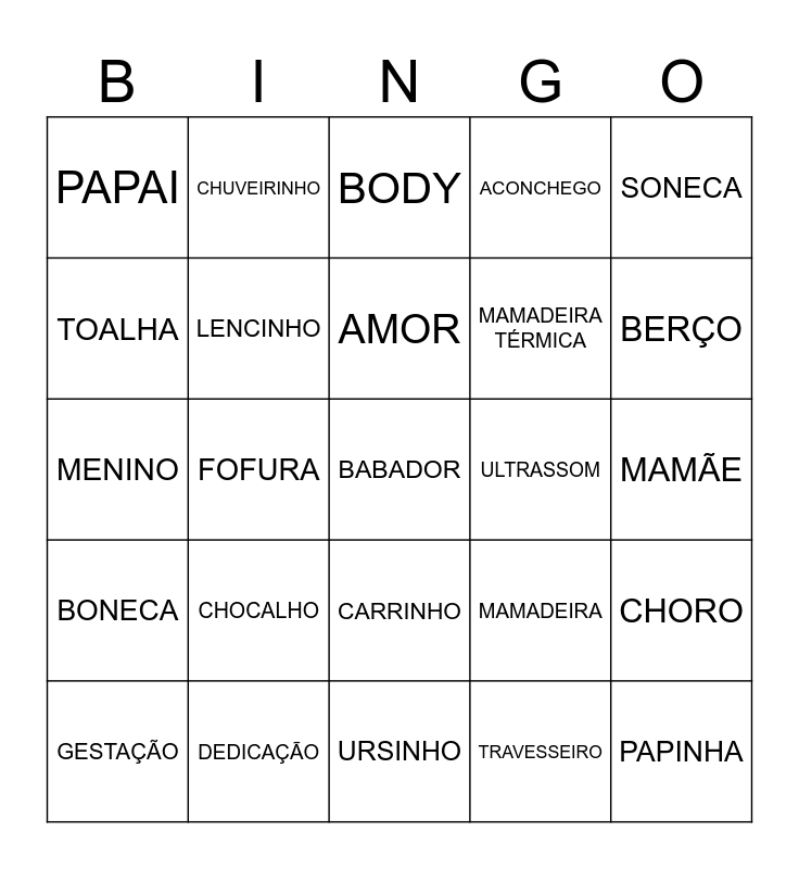 This bingo card has a free space and 24 words: CHOCALHO, DEDICAÇÃO, AMOR, GESTAÇÃO, SONECA, PAPAI, TOALHA, CHUVEIRINHO, ULTRASSOM, CARRINHO, MAMADEIRA TÉRMICA, MENINO, MAMADEIRA, CHORO, LENCINHO, TRAVESSEIRO, MAMÃE, BODY, BERÇO, FOFURA, PAPINHA, BONECA, ACONCHEGO and URSINHO.