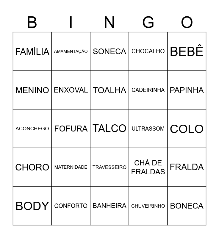 This bingo card has a free space and 24 words: MATERNIDADE, CONFORTO, TOALHA, BODY, BEBÊ, FAMÍLIA, MENINO, AMAMENTAÇÃO, ULTRASSOM, TRAVESSEIRO, CADEIRINHA, ACONCHEGO, CHÁ DE FRALDAS, FRALDA, ENXOVAL, CHUVEIRINHO, COLO, SONECA, PAPINHA, FOFURA, BONECA, CHORO, CHOCALHO and BANHEIRA.