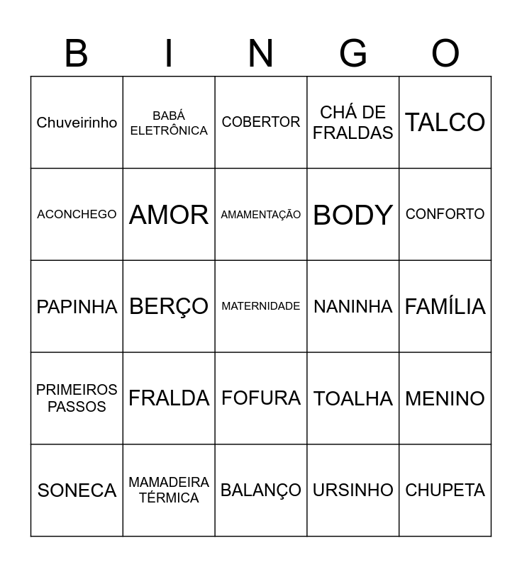 This bingo card has a free space and 24 words: FRALDA, MAMADEIRA TÉRMICA, AMAMENTAÇÃO, SONECA, TALCO, Chuveirinho, ACONCHEGO, BABÁ ELETRÔNICA, NANINHA, FOFURA, BODY, PAPINHA, TOALHA, MENINO, AMOR, URSINHO, FAMÍLIA, COBERTOR, CONFORTO, BERÇO, CHUPETA, PRIMEIROS PASSOS, CHÁ DE FRALDAS and BALANÇO.