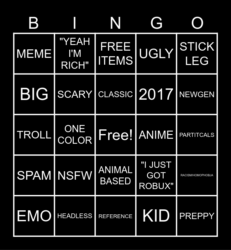 This bingo card has a free space and 24 words: NSFW, HEADLESS, CLASSIC, EMO, STICK LEG, MEME, BIG, "YEAH I'M RICH", ANIME, ANIMAL BASED, 2017, TROLL, "I JUST GOT ROBUX", RACISM/HOMOPHOBJA, SCARY, KID, PARTITCALS, FREE ITEMS, NEWGEN, ONE COLOR, PREPPY, SPAM, UGLY and REFERENCE.