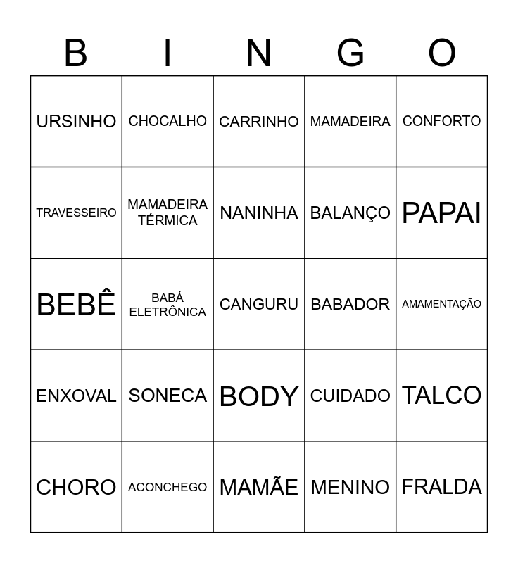 This bingo card has a free space and 24 words: SONECA, ACONCHEGO, NANINHA, CHORO, CONFORTO, URSINHO, TRAVESSEIRO, CHOCALHO, BABADOR, BODY, BALANÇO, BEBÊ, CUIDADO, TALCO, MAMADEIRA TÉRMICA, MENINO, AMAMENTAÇÃO, CARRINHO, PAPAI, BABÁ ELETRÔNICA, FRALDA, ENXOVAL, MAMADEIRA and MAMÃE.