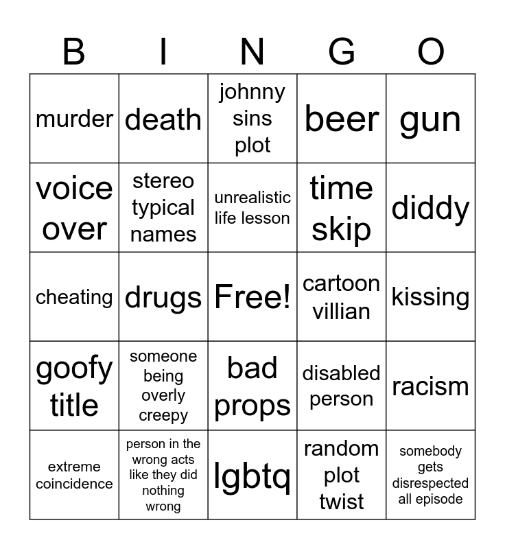 This bingo card has a free space and 24 words: someone being overly creepy, person in the wrong acts like they did nothing wrong, unrealistic life lesson, extreme coincidence, gun, murder, voice over, death, cartoon villian, bad props, time skip, cheating, disabled person, racism, stereo typical names, random plot twist, kissing, johnny sins plot, diddy, drugs, somebody gets disrespected all episode, goofy title, beer and lgbtq.
