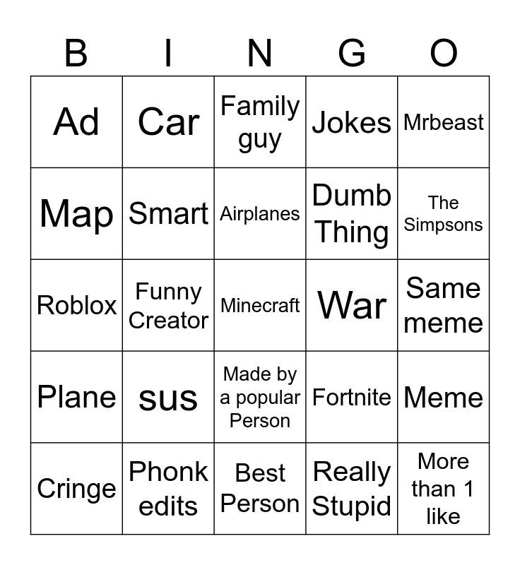 This bingo card has a free space and 24 words: sus, Phonk edits, Airplanes, Cringe, Mrbeast, Ad, Map, Car, War, Made by a popular Person, Dumb Thing, Roblox, Fortnite, Meme, Smart, Really Stupid, Same meme, Family guy, The Simpsons, Funny Creator, More than 1 like, Plane, Jokes and Best Person.