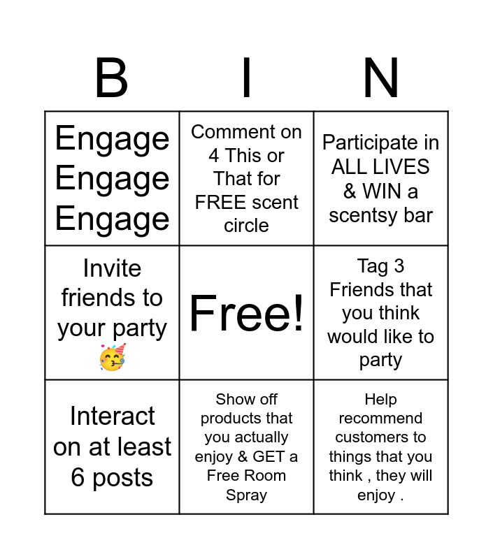 This bingo card has a free space and 8 words: Invite friends to your party 🥳, Comment on 4 This or That for FREE scent circle, Tag 3 Friends that you think would like to party, Interact on at least 6 posts, Participate in ALL LIVES & WIN a scentsy bar, Engage Engage Engage, Show off products that you actually enjoy & GET a Free Room Spray and Help recommend customers to things that you think , they will enjoy ..