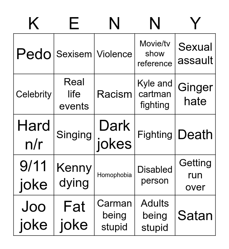 This bingo card has a free space and 24 words: Kenny dying, Fat joke, Racism, Joo joke, Sexual assault, Pedo, Celebrity, Sexisem, Fighting, Homophobia, Kyle and cartman fighting, Hard n/r, Disabled person, Getting run over, Real life events, Adults being stupid, Death, Violence, Ginger hate, Singing, Satan, 9/11 joke, Movie/tv show reference and Carman being stupid.