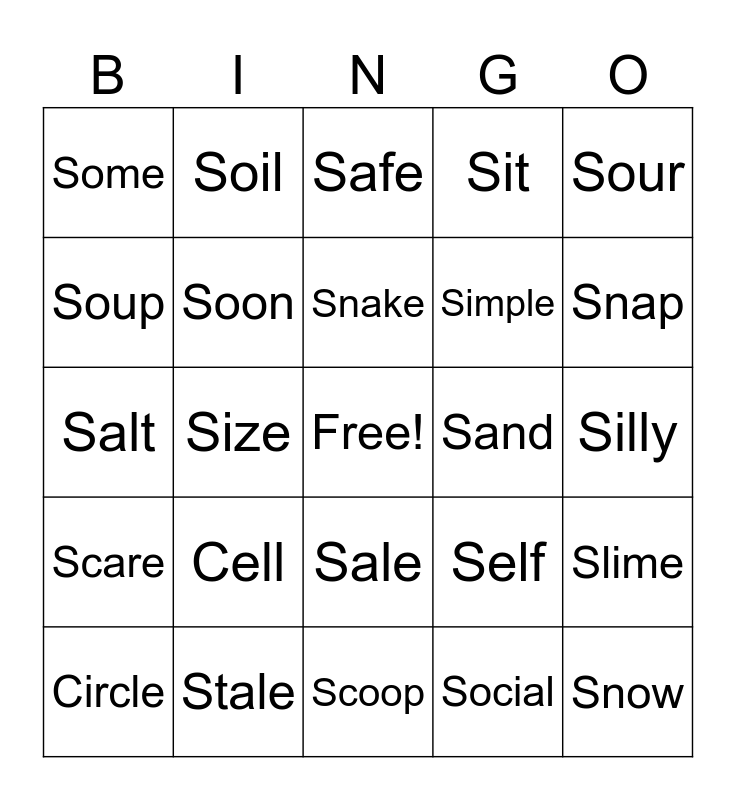 This bingo card has a free space and 24 words: Cell, Stale, Snake, Circle, Sour, Some, Soup, Soil, Sand, Sale, Simple, Salt, Self, Slime, Soon, Social, Silly, Safe, Snap, Size, Snow, Scare, Sit and Scoop.