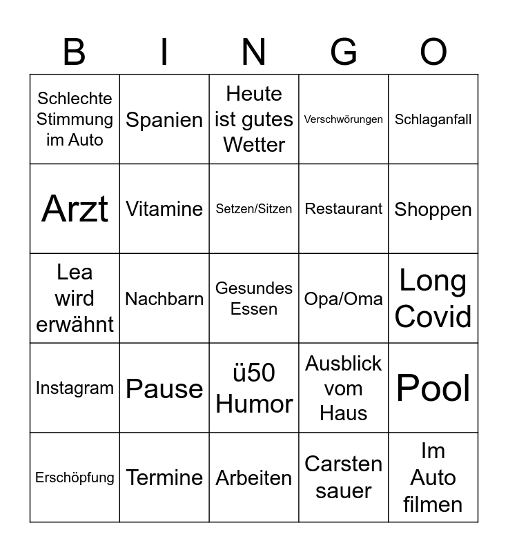 This bingo card has a free space and 24 words: Erschöpfung, Pause, Setzen/Sitzen, Carsten sauer, Schlaganfall, Schlechte Stimmung im Auto, Spanien, Heute ist gutes Wetter, Opa/Oma, Long Covid, Lea wird erwähnt, Vitamine, Ausblick vom Haus, Pool, Arzt, Termine, Arbeiten, Verschwörungen, Shoppen, Instagram, Nachbarn, ü50 Humor, Restaurant and Im Auto filmen.
