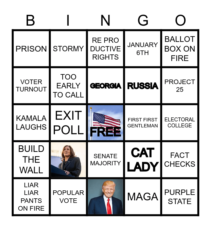 This bingo card has 2 images, a free space and 22 words: POPULAR VOTE, GEORGIA, LIAR LIAR PANTS ON FIRE, BALLOT BOX ON FIRE, PRISON, VOTER TURNOUT, STORMY, FIRST FIRST GENTLEMAN, SENATE MAJORITY, RUSSIA, KAMALA LAUGHS, CAT LADY, FACT CHECKS, TOO EARLY TO CALL, MAGA, ELECTORAL COLLEGE, RE PRO DUCTIVE RIGHTS, PROJECT 25, EXIT POLL, PURPLE STATE, BUILD THE WALL and JANUARY 6TH.